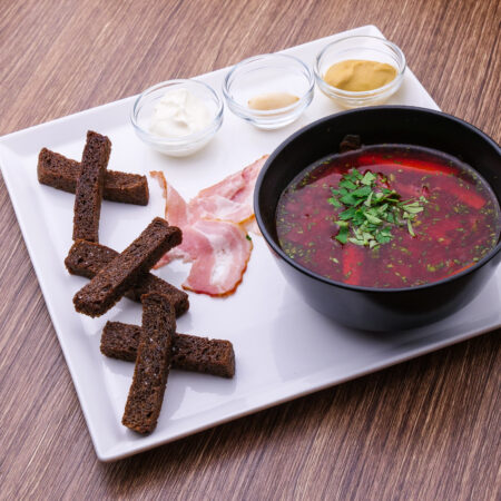 1,590₸Свекла, лук репчатый, морковь, капуста б/к, картофель, томаты, зелень, гренки из чёрного хлеба, чеснок, горчица, сметана, мясо говядины.В корзину -