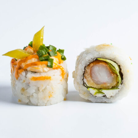 2,450₸Креветка в темпуре, сливочный сыр, лист салата, сырная шапка с фирменным острым соусом и перчиками чили, нори.В корзину -