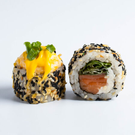 2,850₸Лосось, сливочный сыр, лист салата, масаго, кунжут, сырный соус хайнц, зеленый лук, сырная шапка, нори.В корзину -