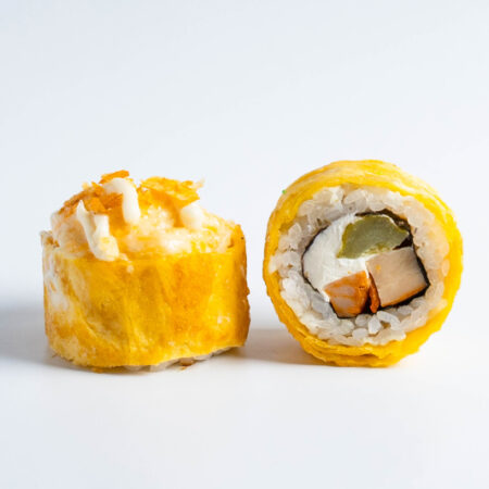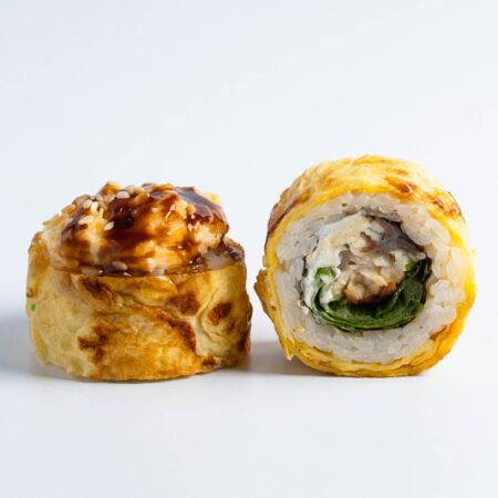 2,650₸Копчёный угорь, сливочный сыр, лист салата, тамаго, сырная шапка с соусом унаги, нори.В корзину -
