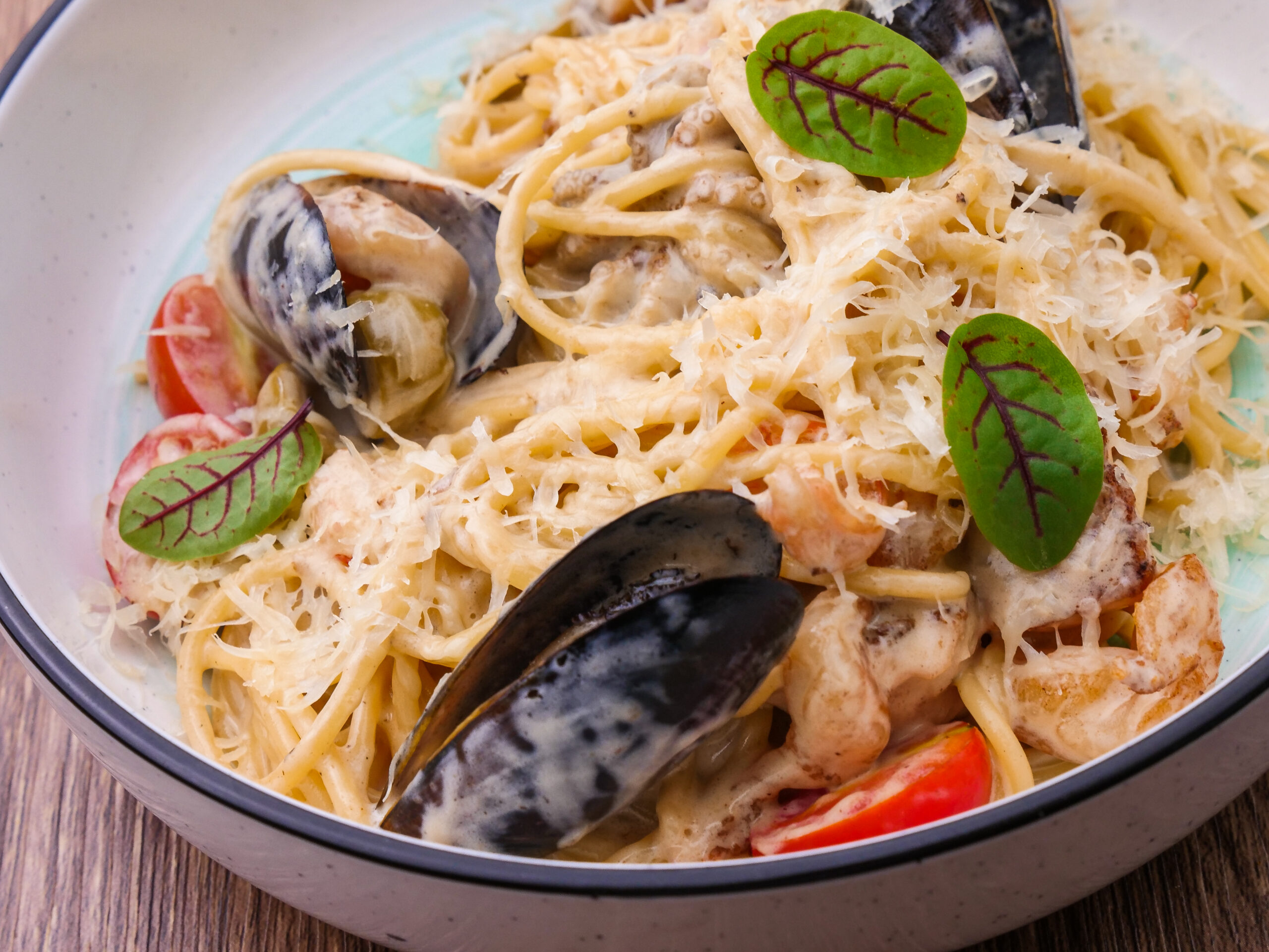 Спагетти, креветки, сёмга, мидии, гребешок, черри, оливки, сливки соус устричный, пармезан.