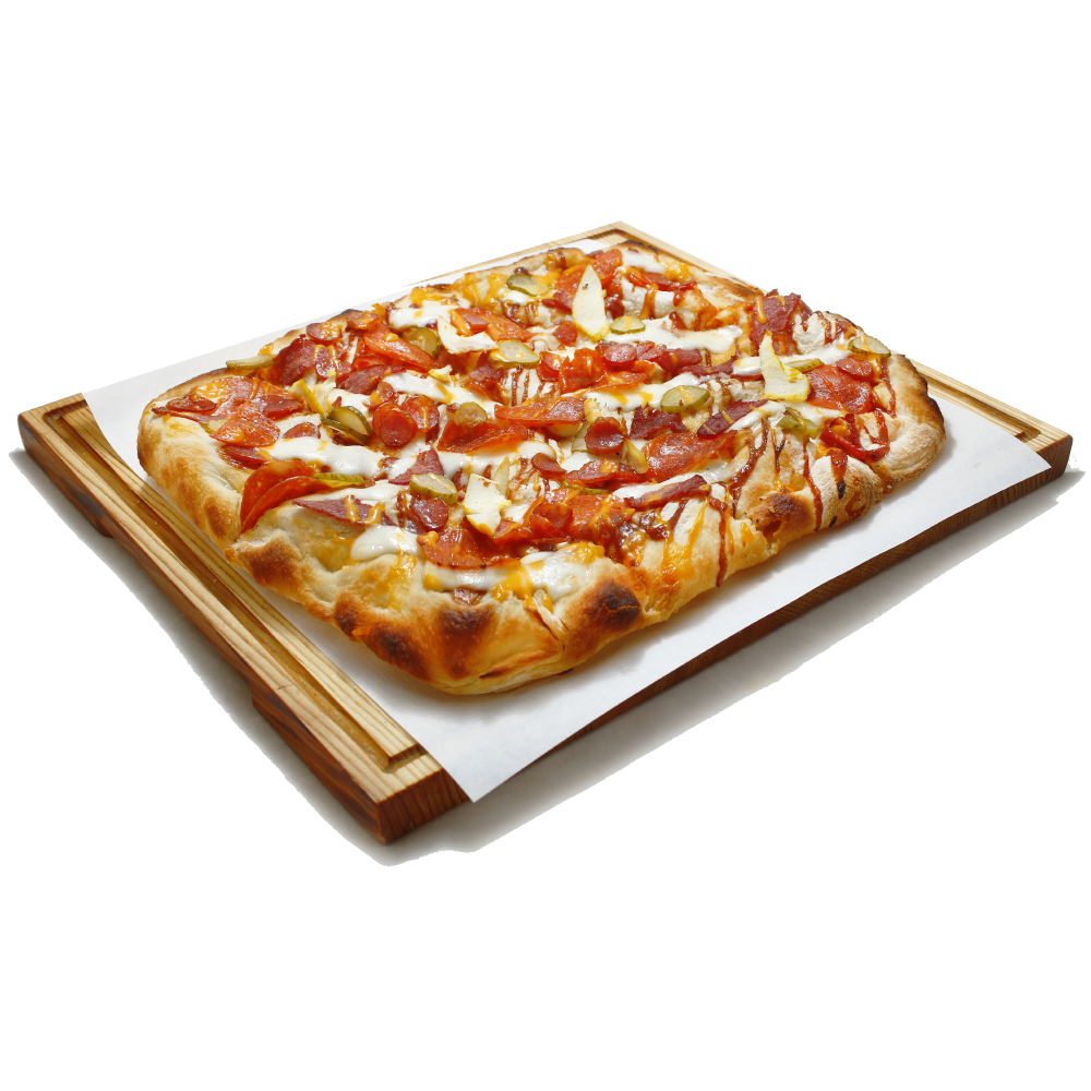 Воздушное римское тесто, соус барбекю, колбаса пеперони, охотничьи колбаски , маслины , бекон сыро-копченой , сыр моцарелла , канкасэ из перца.