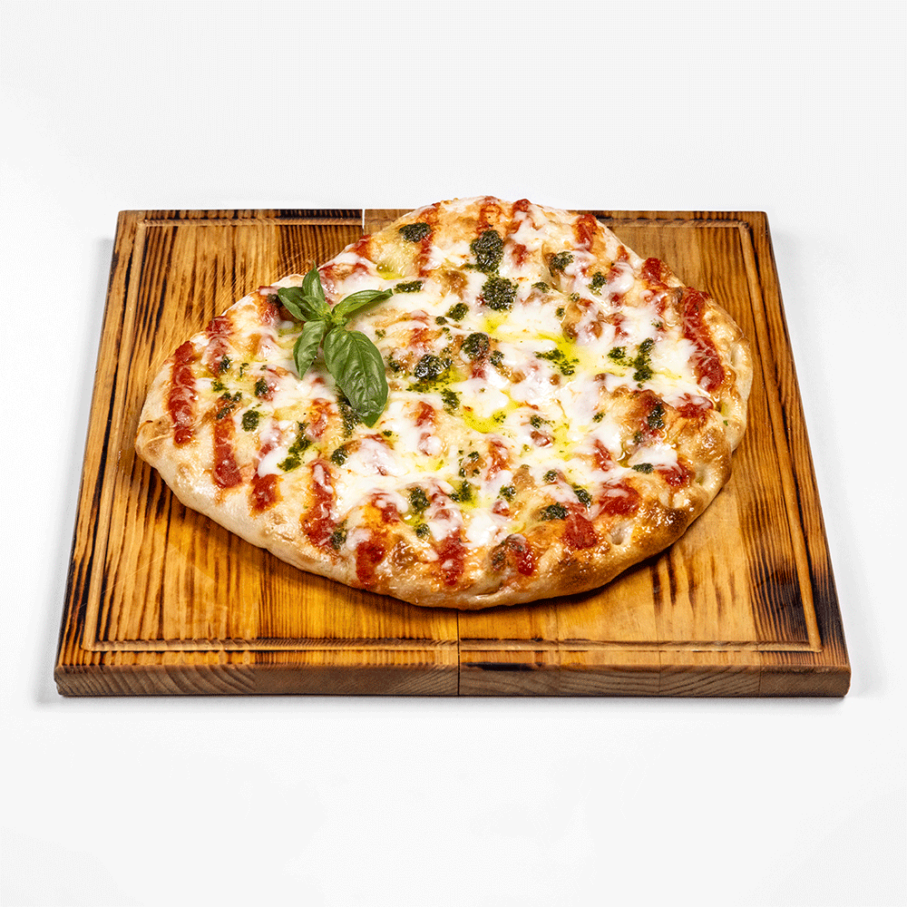 Воздушное римское тесто, сыр моцарелла, сыр пармезан, соус песто, фирменный томатный соус.
