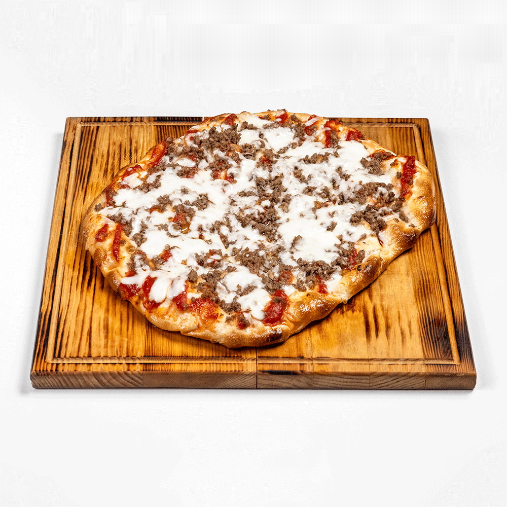Воздушное римское тесто, фарш говяжий, томатный соус, сыр моцарелла.
