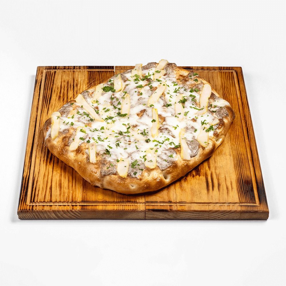 Воздушное римское тесто, сыр моцарелла, сырный соус, говядина вырезка, лук репчатый, горчица зернистая, грибы шампиньоны, корнишоны маринованные