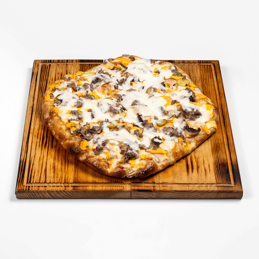 Воздушное римское тесто, сыр моцарелла, сырный соус, говядина вырезка, лук репчатый, горчица зернистая, грибы шампиньоны, корнишоны маринованные