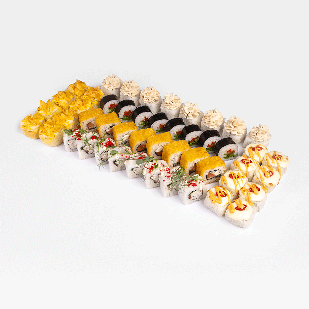 Цезарь с начос (8 шт.), Запечённый ролл с креветками и перчиком чили (8 шт.), Мадрид (8 шт.), Джуниор (8 шт.), Дубль чиз (8 шт.), Яссай маки (8 шт.)