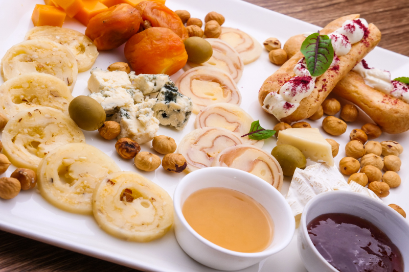 «Дор Блю», «Чеддер», адыгейский, сыр с пармской ветчиной, сыр с орехом и трюфелем, сырные гриссини из тапиоки с творожным кремом и сублимированной малиной, моцарелла с оливой, абрикосики фаршированные сыром и орешками. Мед, соус брусничный, жареный фундук.